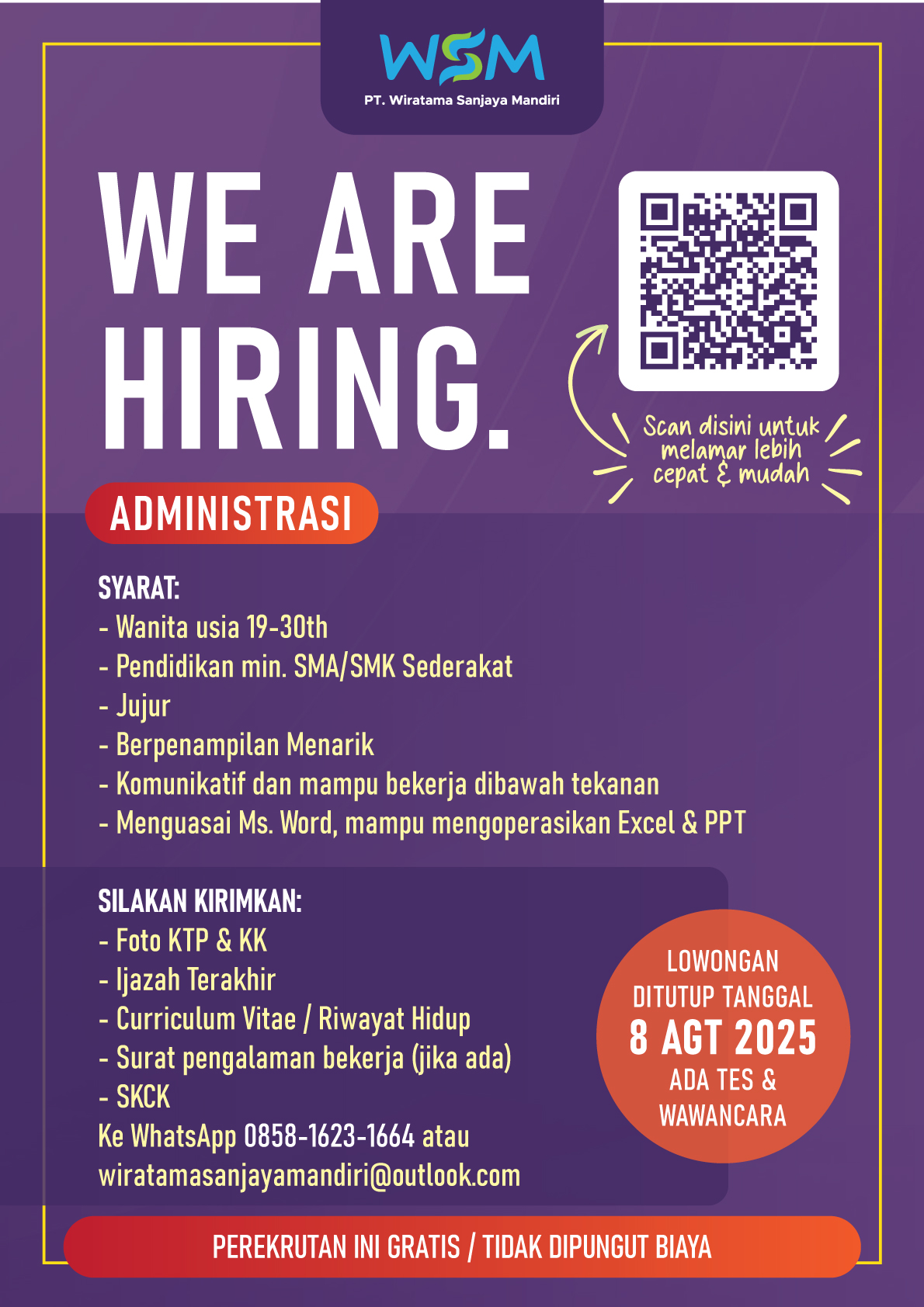 Karir Bergabunglah dengan PT. Wiratama Sanjaya Mandiri dan jadilah bagian dari sumber daya manusia yang berdedikasi dan memiliki kontribusi tinggi terhadap dunia kerja negara Republik Indonesia. Informasi Lowongan Pekerjaan Status: DITUTUPPenempatan: Kota/Kab Kediri, Jawa Timur.Tes Tulis dan Wawancara: 4-6 Agt 2025.Pendaftaran ditutup: 8 Agt 2025<< Klik gambar untuk perbesar >>Ada pertanyaan? Silakan klik tombol dibawah. WhatsApp Narahubung Status: DITUTUPPenempatan: Kota Kediri, Jawa Timur.Tes Tulis dan Wawancara: 20-31 Juli 2025.Pendaftaran ditutup: 29 Juli 2025<< Klik gambar untuk perbesar >>Ada pertanyaan? Silakan klik tombol dibawah. WhatsApp Narahubung Formulir Lamaran Pekerjaan Nama Lengkap *Nama sesuai KTPNomor HP *Contoh: 081234567890Tinggi Badan (cm) *Contoh: 165Berat Badan (kg) *Contoh: 55Alamat Email *Alamat E-mail yang dimasukkan harus aktif. Contoh: wiratama@sanjaya.com.Posisi yang dilamar *Pelamar wajib memilih posisi yang dilamarSilakan PilihCustomer ServiceCleaning ServiceStaff AdministrasiPendidikan Terakhir *Silakan PilihS1/D4/SederajatSMA/SMK/SederajatSMP/SederajatSD/SederajatSurat Lamaran * Upload Foto dan PDF (Maks. 7 file, Maks. ukuran 25MB/file) *Upload: 1. Foto KTP/KK, 2. Pas Foto, 3. Ijazah Terakhir, 4. Curriculum Vitae, 5. Surat pengalaman kerja (jika ada), 6. Penunjang lain mis.: SKCK, Tes Kesehatan, dllDrag and Drop (or) Choose FilesKirim